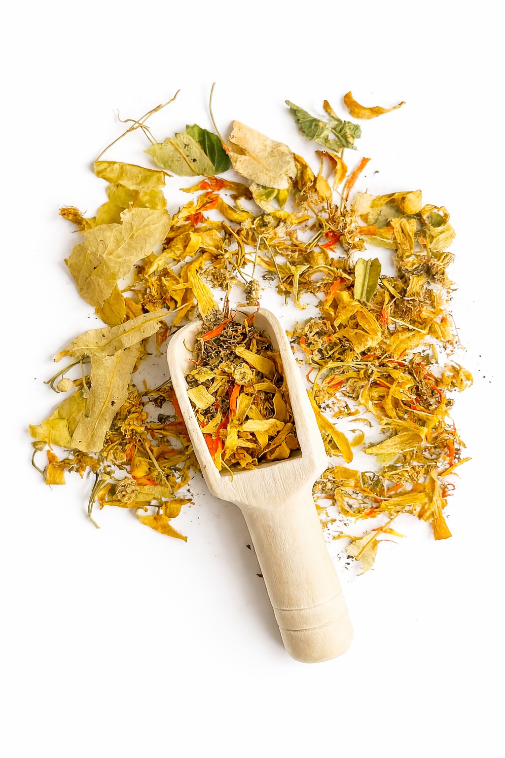 Le carthame, fleur de la circulation et de la chaleur douce, s’unit au tilleul, symbole de réconfort et de relâchement, tandis que le calendula enveloppe l’ensemble de sa tendresse solaire.